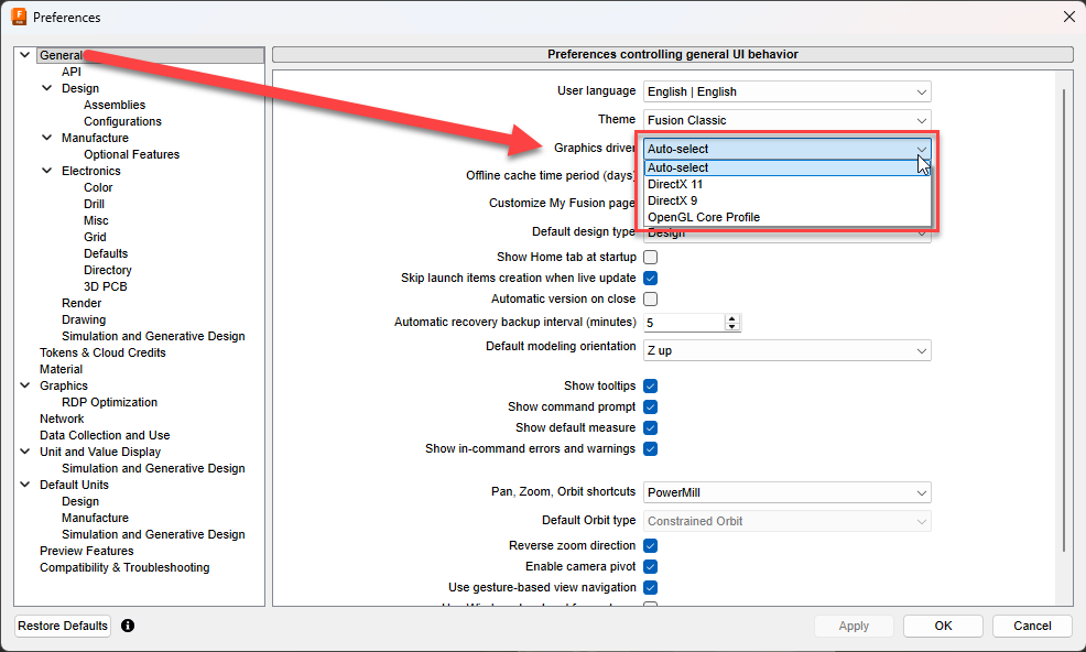 - Ensure that graphics drivers are fully updated. The date of graphics drivers can be seen in the Graphics Diagnostic window. See How to get graphics diagnostic information in Fusion.